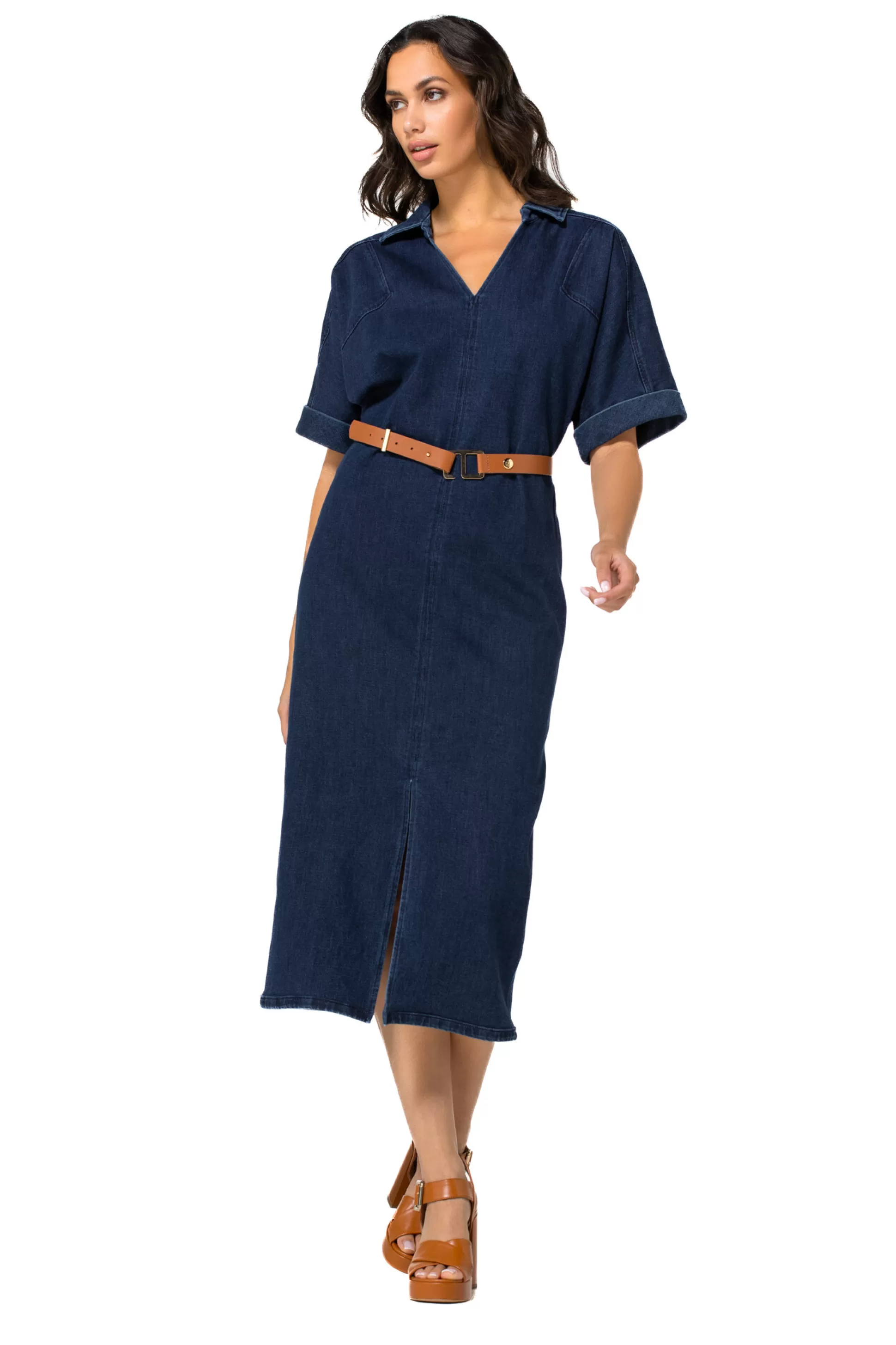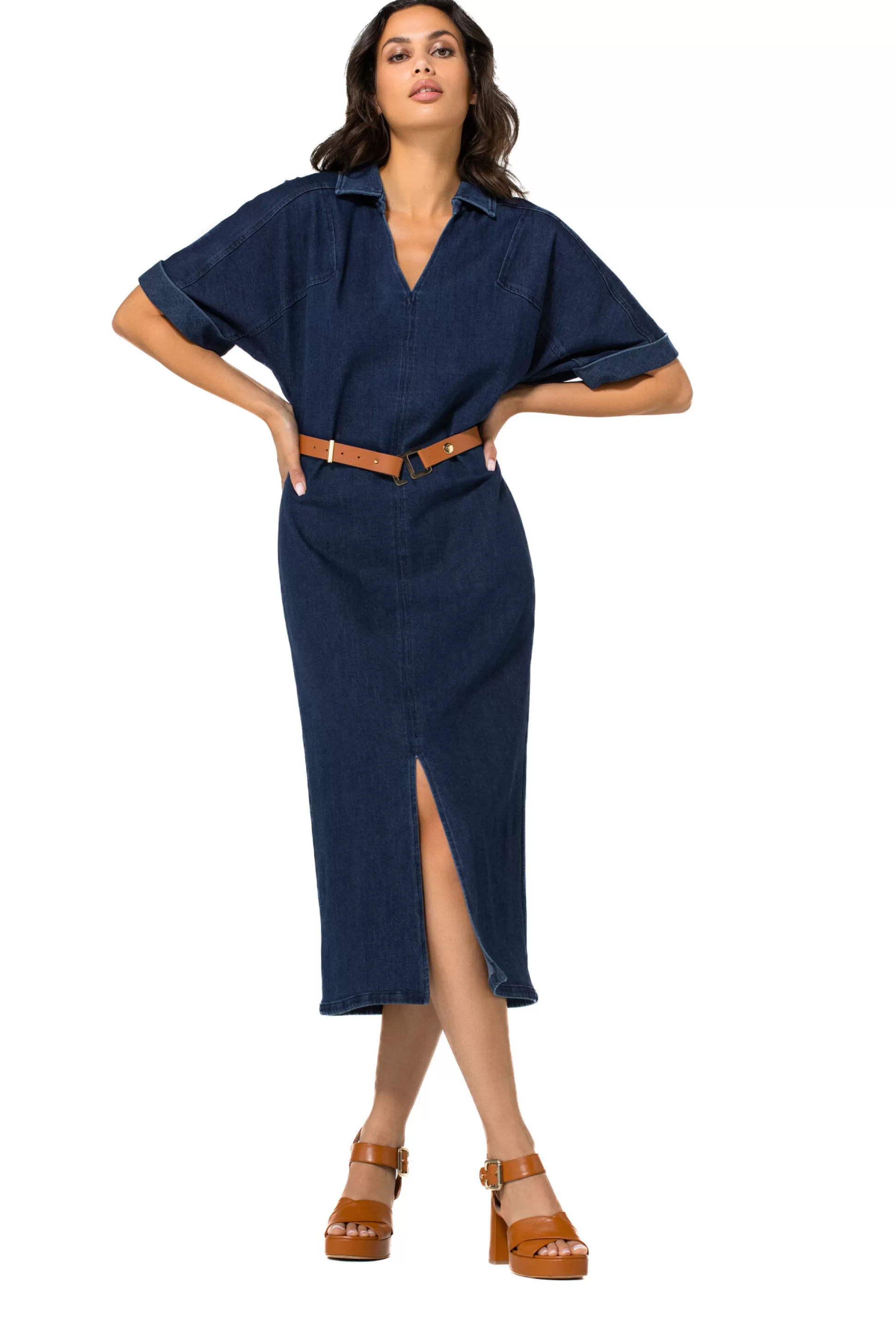 Robe Mi-Longue Droite En Jean Extensible &Nbsp;Non Doublée Pour Plus De Confort Pas De Poches Manches Courtes Larges Av…