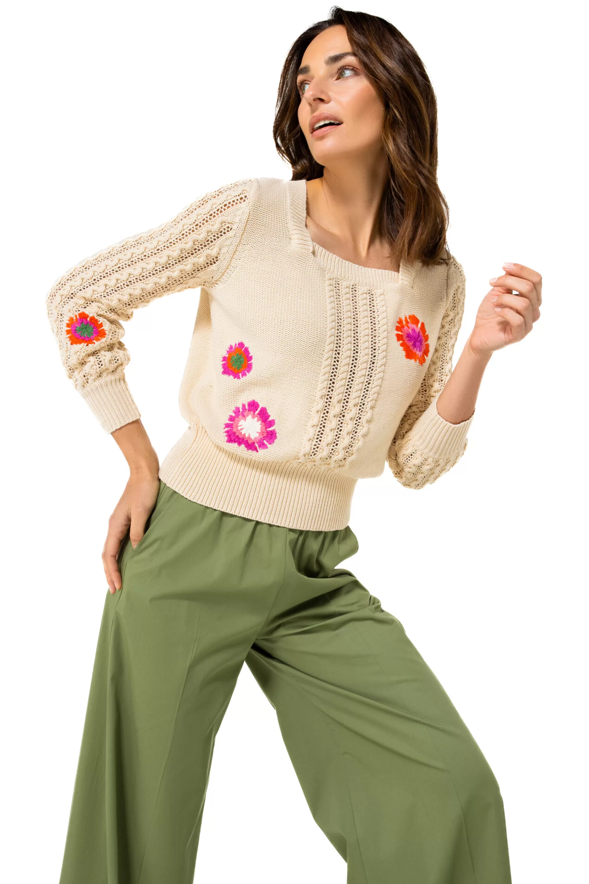 Pull En Coton Avec Broderie &Nbsp;Manches Longues Avec Effet Boule Aux Poignets Ourlet Haut Décolleté Carré