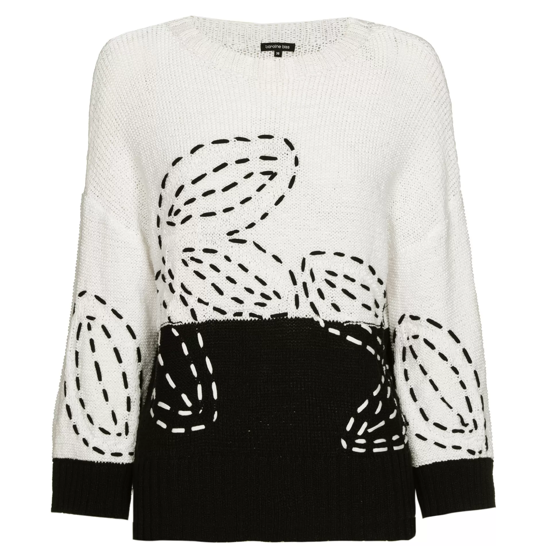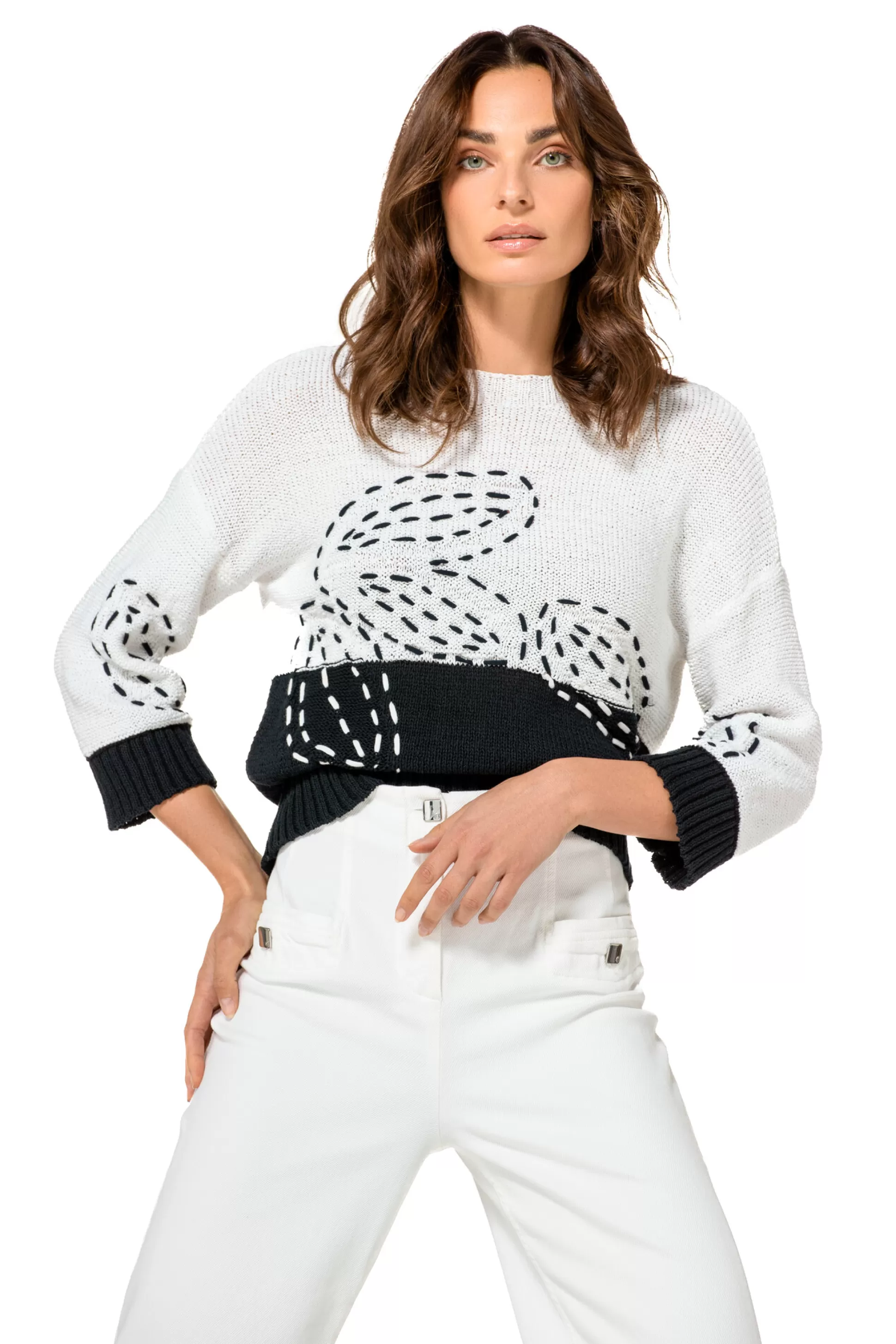 Pull En Coton Bicolore &Nbsp;Manches 3/4 Avec Poignets Ourlet Haut Large Col Rond