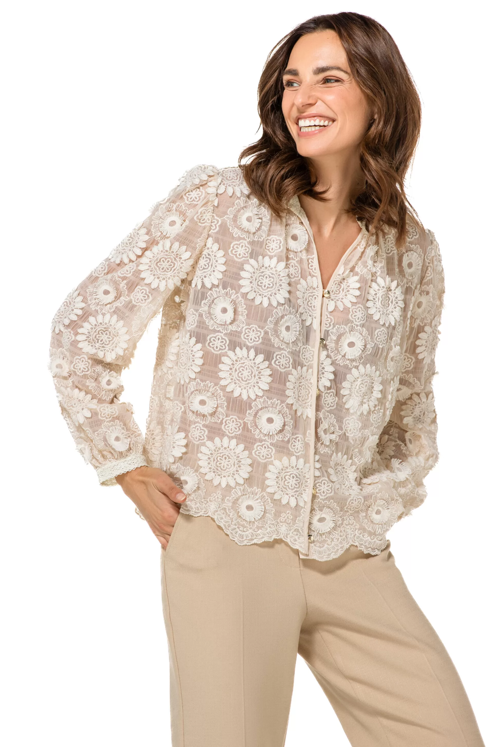 Blouse Coupe Droite En Tulle Stretch Avec Broderie &Nbsp;Manches Longues Avec Poignets Fermeture Bouton Au Milieu Devant…