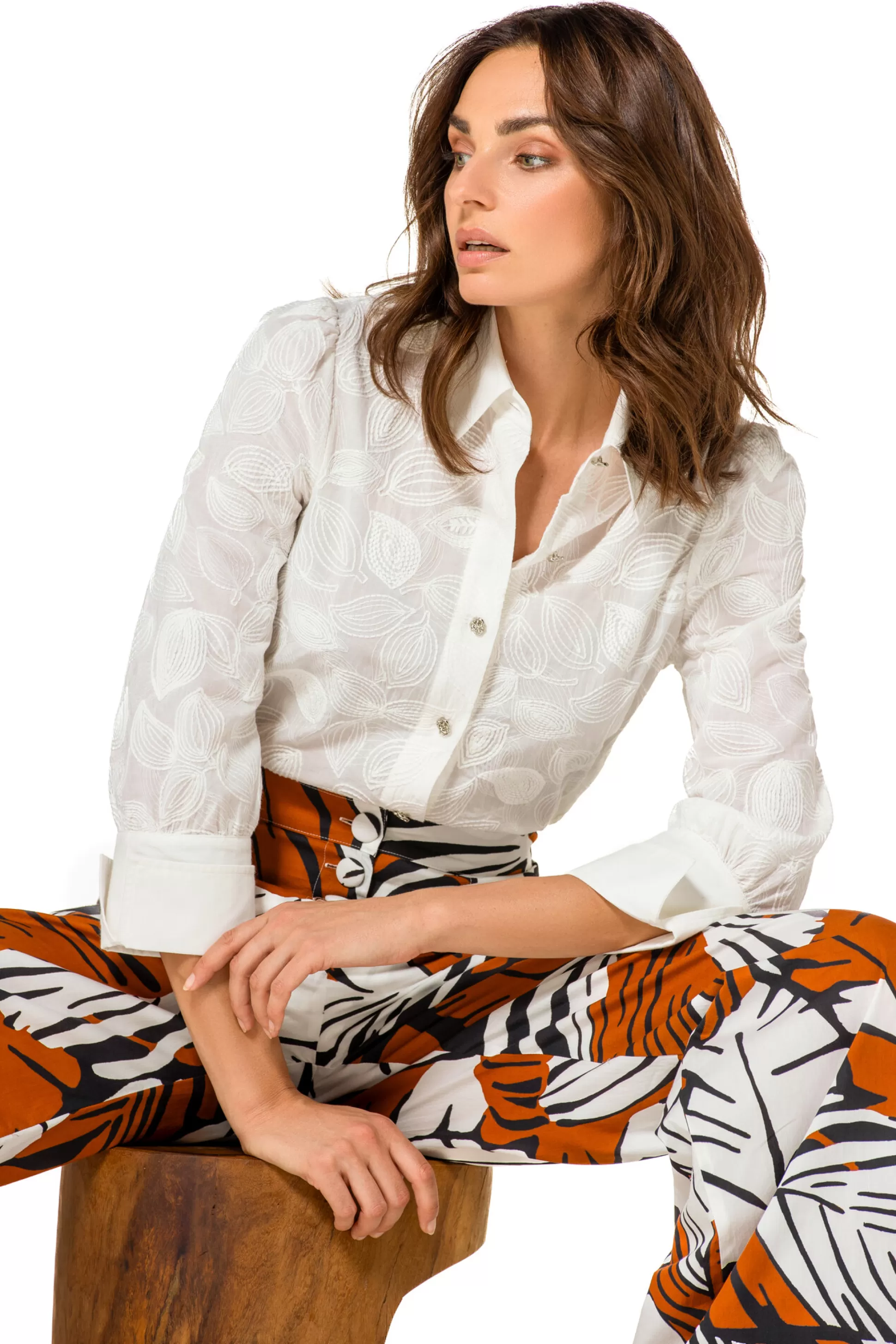 Blouse Droite En Coton Avec Broderie &Nbsp;Manches 3/4 Avec Col Revers Fermeture Boutonnée Milieu Devant Arrondi Col À…