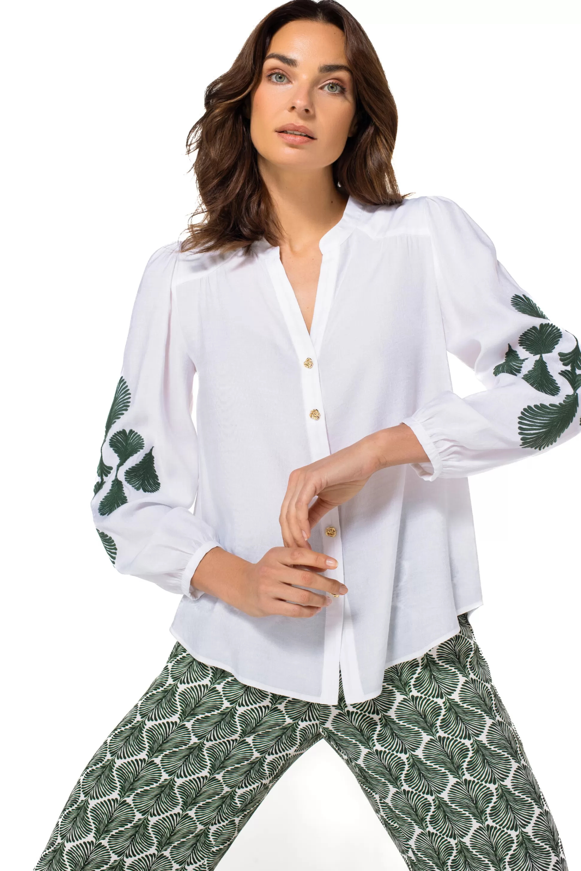 Blouse Droite Souple Avec Broderie &Nbsp;Manches Longues Larges Avec Effet Boule Fermeture Boutonnée Au Milieu Devant O…