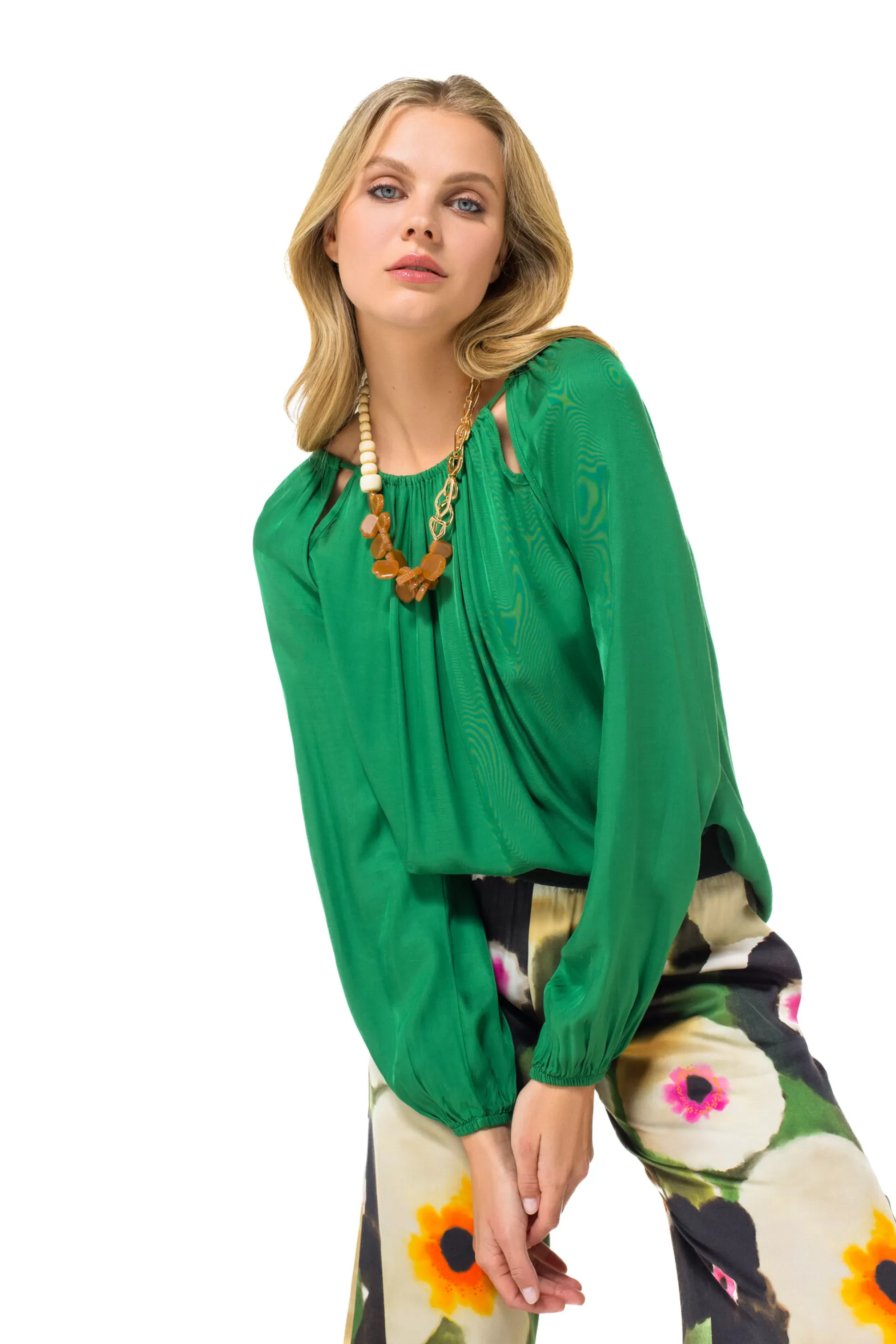 Blouse Droite Fluide Effet Décolleté &Nbsp;Manches Longues Avec Poignets Élastiques Bas Arrondi Franges Sur Le Décol…