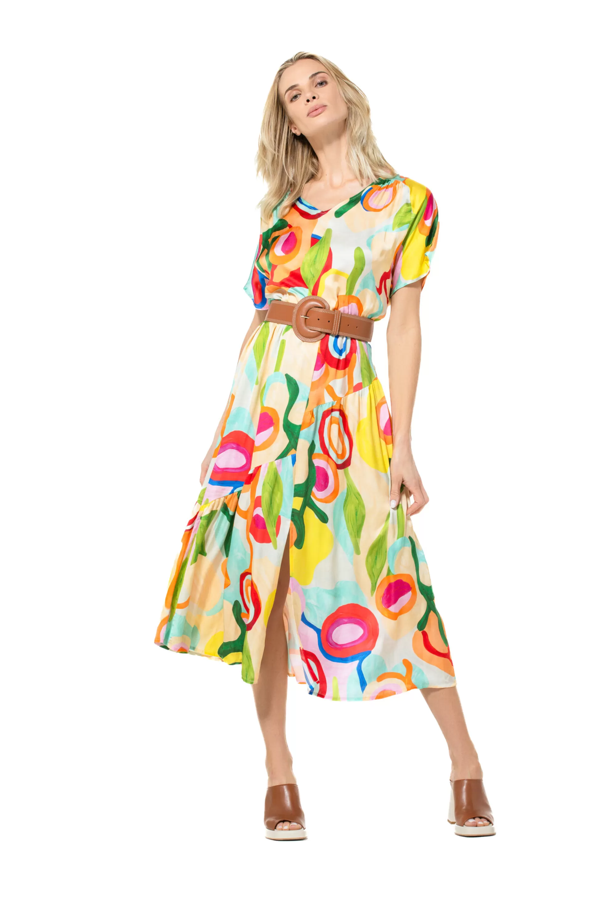 Robe Midi Frivole &Nbsp;Non Doublé Pas De Fermeture Pas De Poches Ceinture Incluse Fente Haute Sur Le Devant Effet Flor…