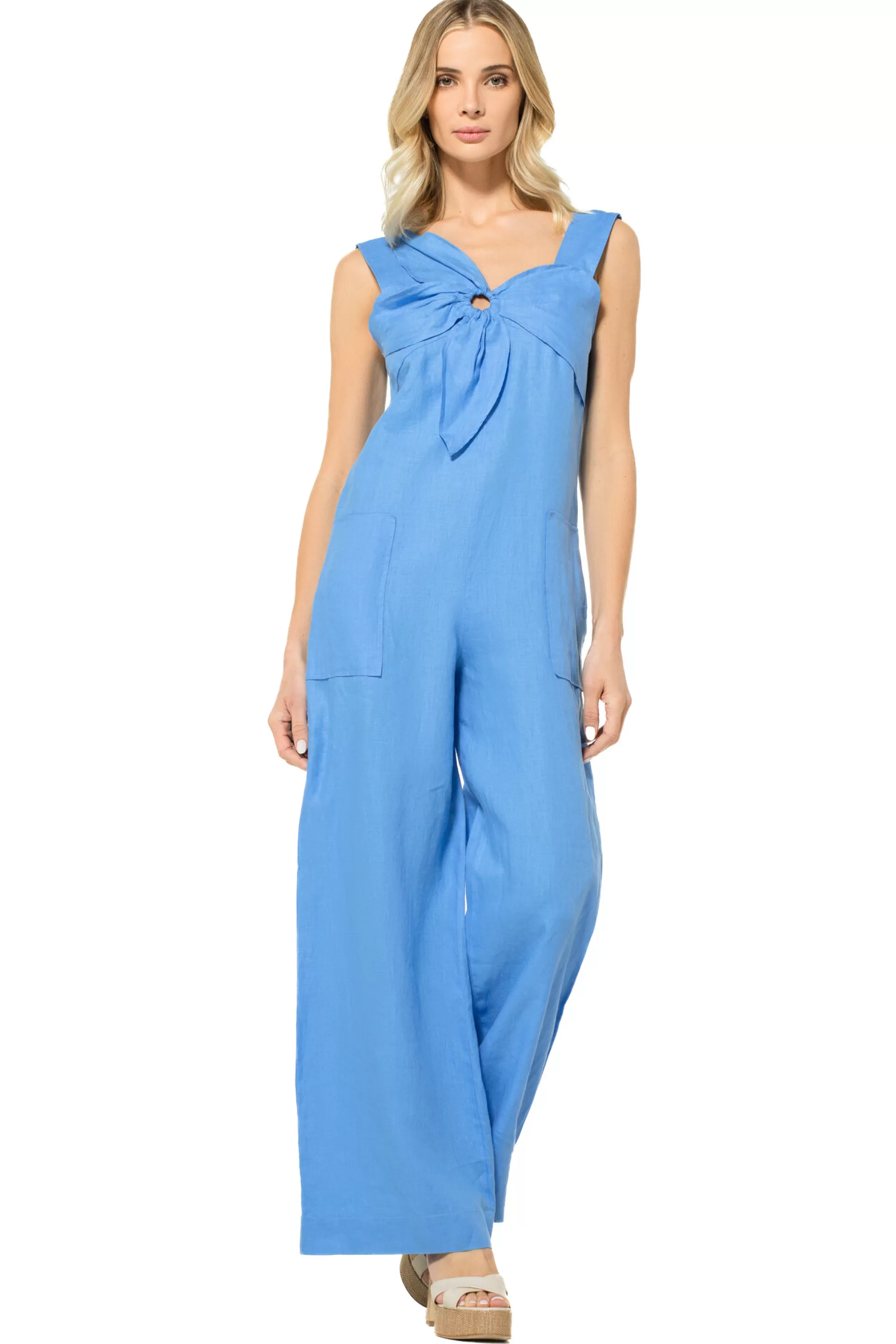 Combinaison En Lin &Nbsp;Fermeture Éclair Dissimulée Au Milieu Du Dos Poches Cousues Effet Nœud Sur La Poitrine Jambe…